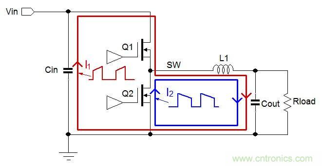 當(dāng)上橋MOSFET Q1導(dǎo)通的時(shí)候,電流從電源流出,經(jīng)Q1和L1后進(jìn)入輸出電容和負(fù)載,再經(jīng)地線回流至電源輸入端。在此過(guò)程中,電流中的交變成分會(huì)流過(guò)輸入電容和輸出電容。這里所說(shuō)的電流路徑如圖2中的紅線所示,它被標(biāo)注為I1。