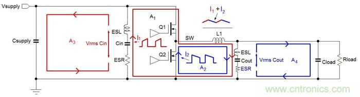 從電磁輻射的角度來(lái)看,圖3中存在陰影的A1區(qū)域是存在高電流變化率dI/dt的回路部分,這個(gè)回路將生成最多的高頻成分,因而在Buck轉(zhuǎn)換器的EMI設(shè)計(jì)中是需要被重點(diǎn)考慮的最關(guān)鍵部分。圖中A2區(qū)域的電流變化率dI/dt就沒(méi)有A1區(qū)域的高,因而生成的高頻噪聲也就比較少。