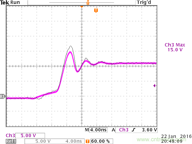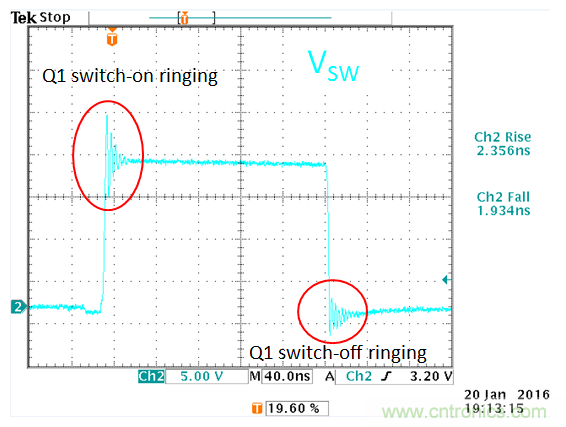 從實(shí)驗(yàn)結(jié)果來(lái)看,開(kāi)關(guān)切換波形上的過(guò)沖實(shí)際上已經(jīng)消失了,但還存在低頻的振鈴信號(hào)。