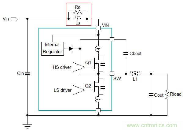在理想狀況下,輸入、輸出電容對(duì)于Buck轉(zhuǎn)換器的開(kāi)關(guān)電流來(lái)說(shuō)都具有極低的阻抗。但在實(shí)際上,電容都存在ESR和ESL,它們都增加了電容的阻抗,并且導(dǎo)致上面出現(xiàn)額外的高頻電壓跌落。這種電壓跌落將在電源供應(yīng)線路上和負(fù)載連接電路上形成相應(yīng)的電流變化,見(jiàn)圖4。