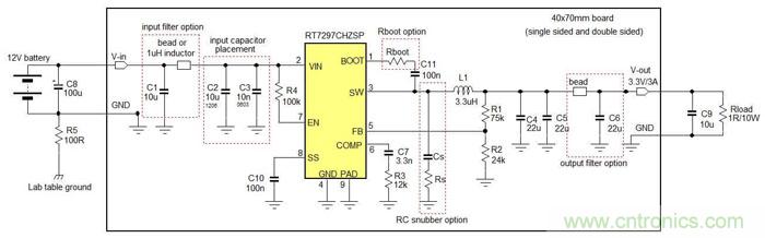 本章將示范在Buck轉(zhuǎn)換器的EMI設(shè)計(jì)中的不同方法所導(dǎo)致的影響。示范所使用的IC是RT7297CHZSP,一款800kHz工作頻率、3A輸出能力的電流模式Buck轉(zhuǎn)換器,采用PSOP-8封裝。測(cè)試中的電路工作在12V輸入下,輸出為3.3V/3A,測(cè)試所用電路顯示在圖12中。