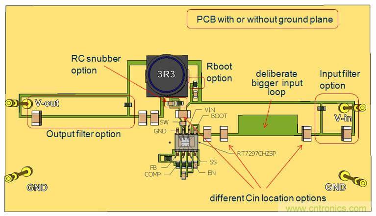 在此實(shí)驗(yàn)中,我們使用雙面PCB,輸入電容的放置位置如上面的實(shí)驗(yàn)2一樣,這樣的配置可以在輸入回路中引入比較明顯的輻射。