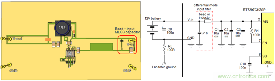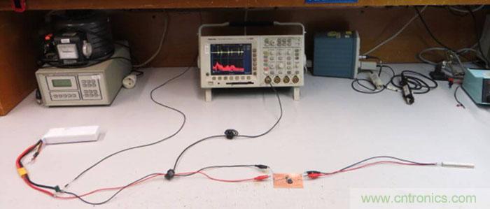 輸入線靠電池一側(cè)的接地端通過(guò)一只100Ω的電阻和實(shí)驗(yàn)臺(tái)的地連接在一起,這就給整個(gè)電路提供了一個(gè)參考地,其阻抗很像EMC測(cè)試中的LISN網(wǎng)絡(luò)。