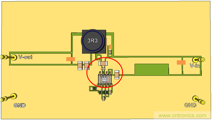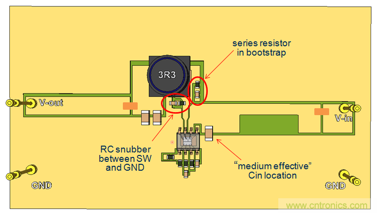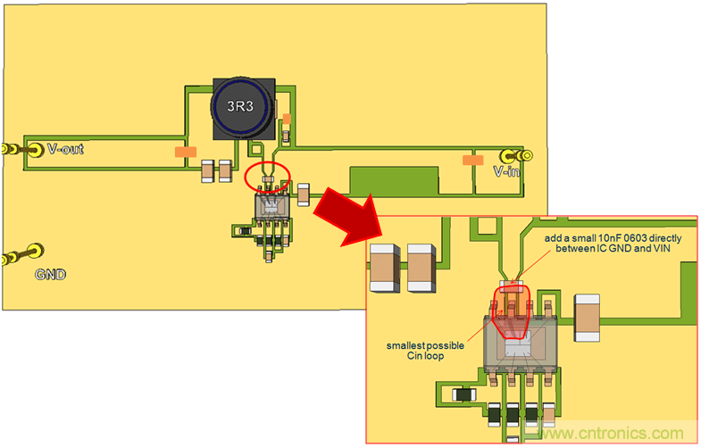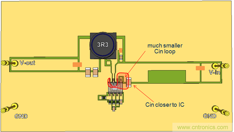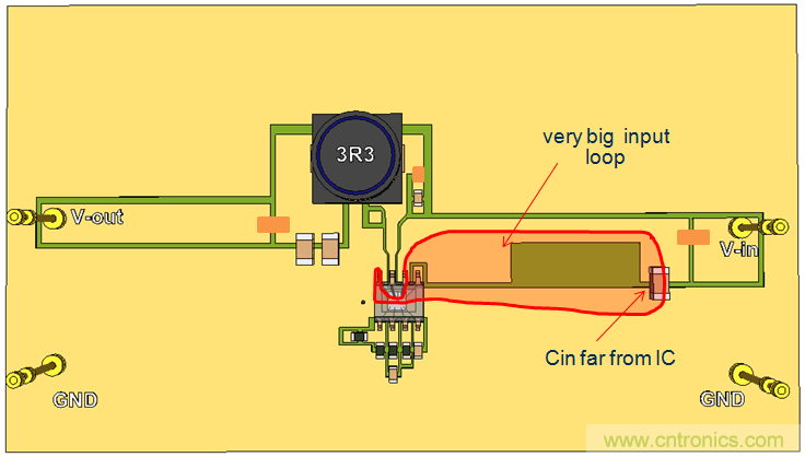 我們繼續(xù)使用單面PCB,并將CIN放置到靠近IC的地方,這樣就形成了比較小的CIN回路。參見(jiàn)圖20。