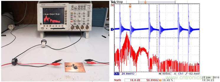 這種環(huán)形天線可以被連接到頻譜分析儀上,當(dāng)你使它在PCB上方移動(dòng)時(shí),你就可以看到哪里會(huì)有比較強(qiáng)的高頻磁場(chǎng)。你也可以把它連接到一臺(tái)示波器上(使用50Ω的端子),示波器上就可以顯示出相應(yīng)區(qū)域的切換噪聲水平。保持天線環(huán)和板子之間的相對(duì)位置和距離不變,對(duì)電路、PCB上的回路做出某些改變,你就可以知道噪聲水平在增加或是減少。