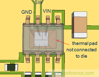 在RT7297CHZSP中,芯片底部的散熱焊盤(pán)是沒(méi)有和晶圓內(nèi)核連接在一起的,所以在PCB布局中將銅箔和散熱焊盤(pán)連接在一起并不能縮短CIN回路。它的上橋MOSFET和下橋MOSFET通過(guò)多根邦定線連接到VIN和GND端子,因而可以通過(guò)這兩個(gè)端子形成最短的回路。