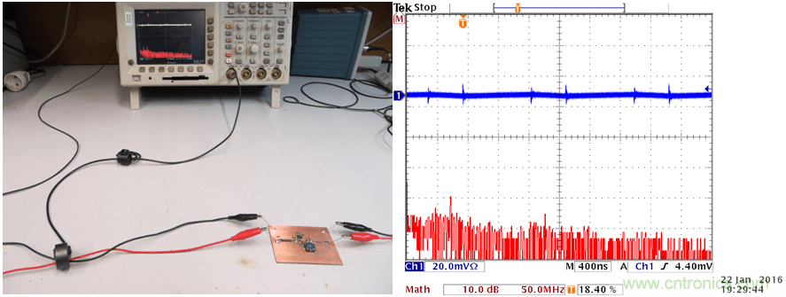 電源輸入線上的高頻電流由差模電流和共模電流構(gòu)成。對(duì)于共模電流,可以在PCB布局設(shè)計(jì)時(shí)將具有高電流變化率dI/dt的電流環(huán)最小化予以消減。而差模電流則有不同的來(lái)源,我們可以如圖27那樣將正、負(fù)兩條線以不同方向穿過(guò)自制的電流探頭的磁芯來(lái)進(jìn)行測(cè)量。