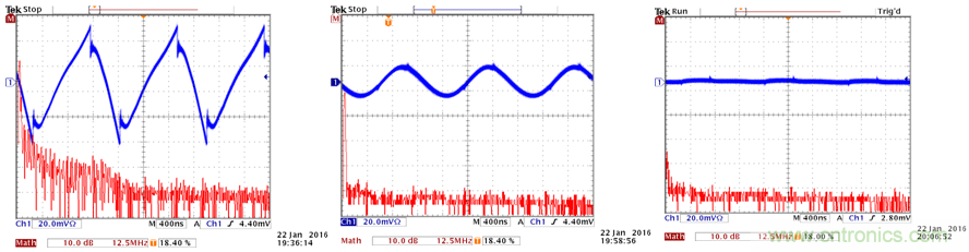 正如從圖29中看到的那樣,添加磁珠 + 電容構(gòu)成的濾波器可濾除除800kHz基波以外的所有高頻成分,添加1µH電感 + 電容構(gòu)成的濾波器可消除包含基波在內(nèi)的所有差模噪聲。