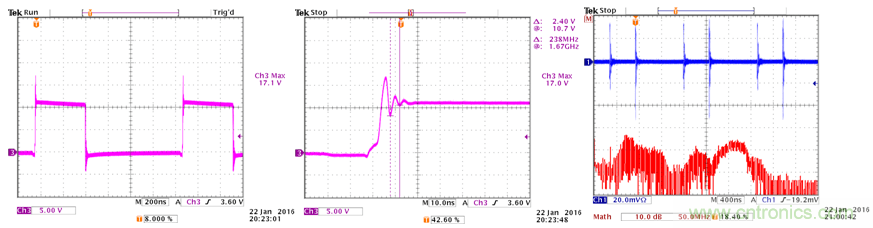 開(kāi)關(guān)切換波形顯示出5V的過(guò)沖,過(guò)沖信號(hào)的振蕩頻率為238MHz;輸入線上的共模電流顯示出明顯的高頻噪聲。參考圖33。