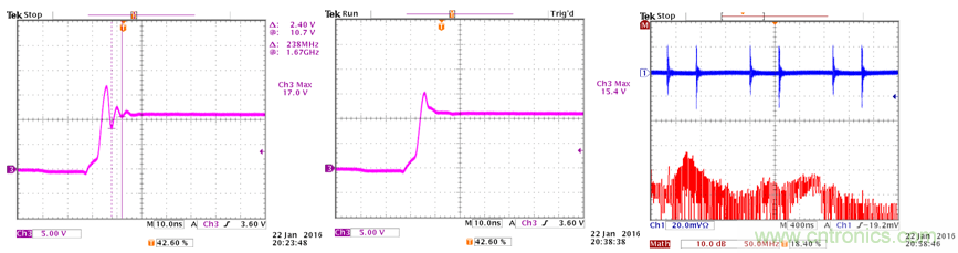 開(kāi)關(guān)切換過(guò)程中的過(guò)沖和振鈴信號(hào)的幅度都降低了大約50%,輻射的強(qiáng)度下降了大約10dB,頻帶寬度擴(kuò)展到了300MHz。