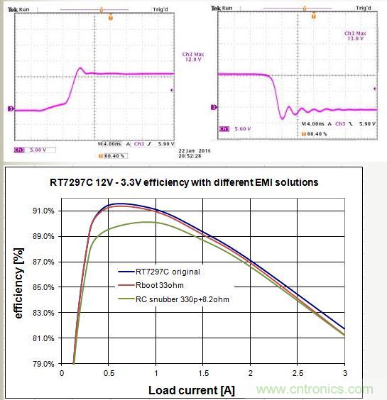 RC平滑抑制電路對(duì)效率的影響會(huì)比較大,特別是在輕載和中等負(fù)載的情況下,但最大也就1~2%,處于可以接受的范圍。需要特別注意的是,當(dāng)Buck轉(zhuǎn)換器的工作頻率很高和輸入電壓很高的時(shí)候,RC平滑抑制電路對(duì)效率的影響會(huì)很大。