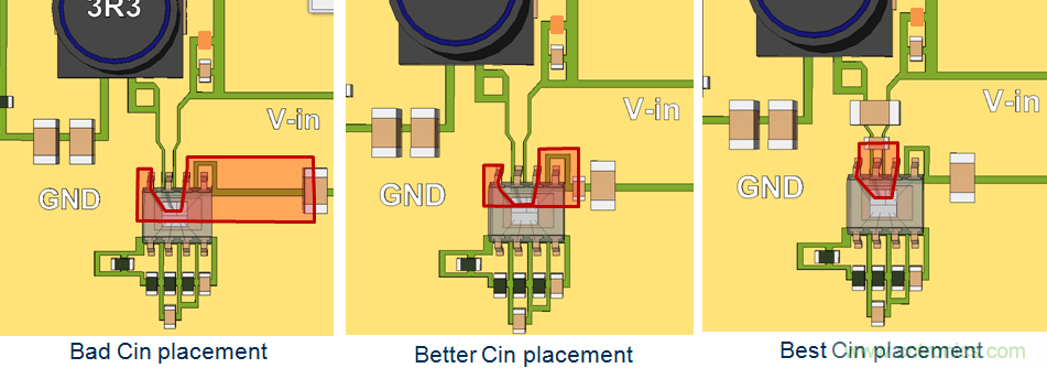 確定開(kāi)關(guān)切換回路的VIN和GND節(jié)點(diǎn)位置,將不同尺寸的輸入電容盡可能靠近這些節(jié)點(diǎn),最小的電容靠節(jié)點(diǎn)的位置要最近。由于這個(gè)切換回路承載了很高的電流變化率dI/dt,因而需要盡可能地小。