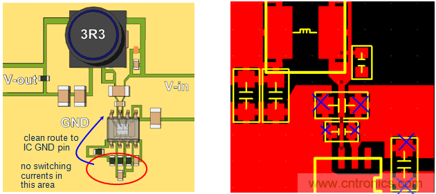 將輸出電容地放在不與輸入電容切換路徑發(fā)生重疊的地方,避免高頻噪聲串入輸出電壓中。