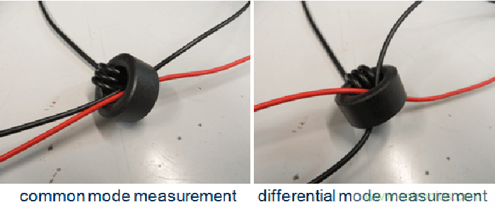 將電源線的正、負(fù)兩條線以同一個(gè)方向穿過(guò)鐵芯可測(cè)量其中的共模電流,顛倒其中一條線的方向則可測(cè)量差模電流。參見(jiàn)圖45。