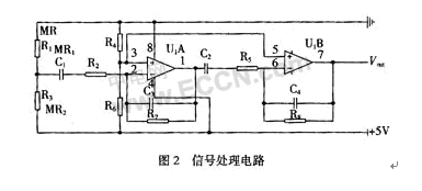信號(hào)采集電路中的InSb-In薄膜磁阻元件采用三端差分型接法如圖1(b)所示,這種信號(hào)采集電路具有輸出信號(hào)較大和較強(qiáng)抑制溫漂的能力。信號(hào)處理電路采用阻容耦合型差動(dòng)放大電路,在圖2中IC1和IC2為兩級(jí)差動(dòng)放大,改變R2,R7,R5,R8的阻值可以調(diào)整放大倍數(shù)。集成運(yùn)放的靜態(tài)電壓由R3和R6來調(diào)節(jié),考慮到通常磁頭內(nèi)的上、下兩個(gè)磁阻元件不完全平衡,MR1與MR2的阻值會(huì)有10%以內(nèi)的差別,在+5 V的工作電源下,信號(hào)采集的輸出端電壓在2.4~2.6 V。為了減少信號(hào)在磁頭與運(yùn)放之間阻容耦合中的損失,一般把集成運(yùn)放靜態(tài)電壓設(shè)置為低于2.5 V,取2 V比較合適。