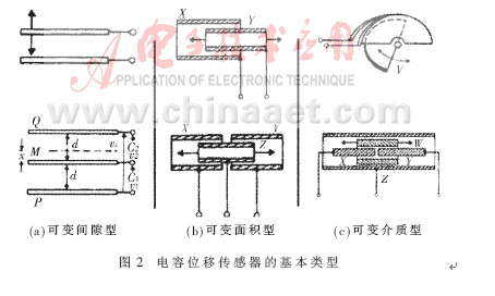 電容位移傳感器的三種基本類型如圖2所示。其具體結(jié)構(gòu)可視實(shí)際運(yùn)用的場(chǎng)合靈活多變,電容極板可以是平面的或者球面的;運(yùn)動(dòng)電極可以采用水銀等導(dǎo)電液體。圖2所示的三種基本類型均可組成差動(dòng)式結(jié)構(gòu),如各分類中下部圖形所示。采用差動(dòng)式結(jié)構(gòu)能夠提高傳感器線路的輸出靈敏度,減小非線性,還能在一定程度上抑制由靜電吸引帶來(lái)的誤差。當(dāng)要求測(cè)量系統(tǒng)具有很高的分辨力時(shí),一般是保持極板面積相對(duì)固定而使電容傳感器極板間隙隨被測(cè)位移改變,即如圖2(a)所示的結(jié)構(gòu)。反之,采用保持間隙恒定而讓極板相對(duì)面積可變的結(jié)構(gòu),則可以在相當(dāng)大的動(dòng)態(tài)范圍內(nèi)獲得線性的響應(yīng)[1]。