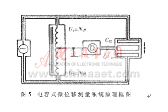 現(xiàn)以設(shè)計(jì)一個(gè)測(cè)量微小位移的系統(tǒng)為例來(lái)說(shuō)明上述測(cè)量方法的應(yīng)用。首先,用高導(dǎo)磁率環(huán)形鐵芯繞制出感應(yīng)耦合比率臂,再設(shè)計(jì)適當(dāng)?shù)目勺冮g距三電極差動(dòng)式電容位移傳感器的結(jié)構(gòu),并采用比率測(cè)量線路,就有如圖5所示的微位移測(cè)量系統(tǒng)原理框圖。對(duì)雙極板電容傳感器,不考慮電場(chǎng)的邊緣效應(yīng),兩個(gè)直接電容為:C12=