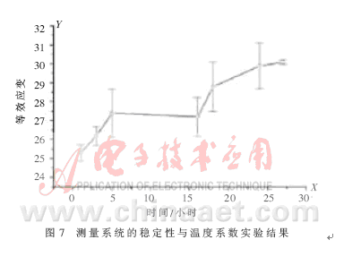 擬合方程顯示在圖中上部的方框里。從實(shí)驗(yàn)結(jié)果可看出,一微米位移可獲得變壓器電橋讀數(shù),變化為127.02,輸出特性的非線性誤差小于0.15%F.S.。比率臂第五檔變化一個(gè)數(shù)對(duì)應(yīng)的位移量根據(jù)傳感器結(jié)構(gòu)的不同,一般在5~8納米之間,末級(jí)的數(shù)據(jù)采集器可獲得300多毫伏的輸出,從數(shù)據(jù)采集器便能夠分辨出0.02納米的變化。在實(shí)驗(yàn)室環(huán)境下,傳感器測(cè)值隨著溫度的變化會(huì)產(chǎn)生極大的漂移,用標(biāo)準(zhǔn)元件來(lái)檢查變壓器電橋測(cè)量系統(tǒng)的溫度系數(shù)與穩(wěn)定性,所得結(jié)果見(jiàn)圖7。在28小時(shí)的實(shí)驗(yàn)期間測(cè)值等效變化僅為0.1納米,環(huán)境溫度變化為3~4℃。作者還曾將差動(dòng)電容式位移傳感器放到100米深的鉆井底部,那里溫度的年變化不到0.03℃,整個(gè)位移測(cè)量系統(tǒng)月漂 移率僅為0.1納米[3]。