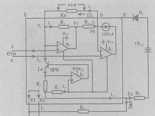 Rs為增益調節(jié)電阻,調節(jié)Rs可使輸入電壓ein在從最小值變到最大值時使輸出電流Io從4mA變到20mA。即△I=16mA的輸出電流。需要注意的是:為使Io不超過20mA,當Rs=∞時,ein不應超過1V,而當Rs減小時,ein也應相應減小。