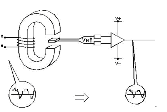 圖1.位于磁性電路間隙中的霍爾發(fā)生器把一次電流產生的磁場轉換成成比例的霍爾電壓。