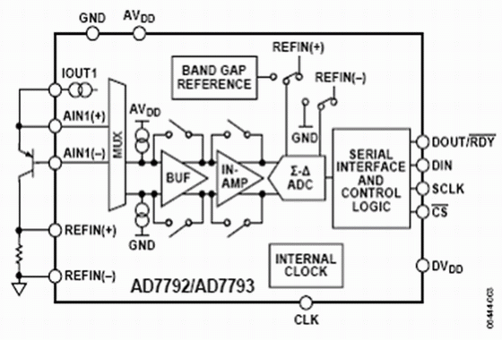 儀表放大器允許開發(fā)低噪聲、低溫漂的增益級電路。低噪聲與低溫漂非常關(guān)鍵,可以保證因溫度變化引起的電壓變化大于儀表放大器的噪聲電壓。AD7793的增益可以設(shè)置為1, 2, 4, 8, 16, 32, 64,或128。利用128倍的最大增益設(shè)置以及產(chǎn)生的基準(zhǔn)電壓源,AD7793的滿度范圍是±1.17 mV/128 mV或者大約±10 mV。這樣,ADC的高分辨率特點保證無需任何外部放大器元件就可以達(dá)到最佳效果。