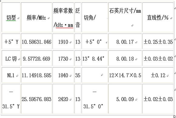 石英晶體的頻率溫度特性方程為:f=fO(1+aΔT+bΔT2+cΔT3),由此可見,通過切角的選擇,使系數(shù)b和c接近于零,可提高頻率溫度的線性度。石英晶體溫度計就是利用石英晶體的頻率溫度特性原理制成的。最先采用的為+5°Y切型,后來美國發(fā)明了溫度特性極好的LC切型,日本發(fā)明了NL切型,東洋通信研制的-31.5°Y切型的詳情見表1。
