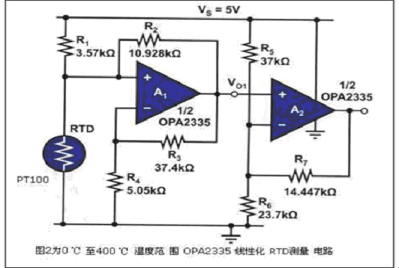 a rtd測量電路-0℃至400℃溫度范圍的ptl00傳感器線性化測量電路