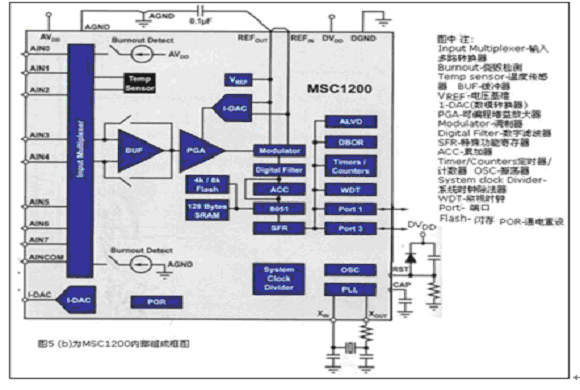 mscl200集成了具有22位有效分辨率的△∑型adc、通用型輸入多路轉(zhuǎn)換器、可選輸入緩沖器和增益調(diào)節(jié)范圍為1-128的可編程增益放大器(pga) ,見圖5(b)所示。該器件包括片上溫度傳感器、快閃存儲器和sram存儲器以及改良型8051-cpu(在功耗相同的情況下,其運行速度可達最初標準版本的3倍)。片上電流數(shù)字-模擬轉(zhuǎn)換器(1-dac)可提供至rtd和熱敏電阻的激勵電流。其mscl200混合信號控制器內(nèi)部框圖見圖5(b)所示。