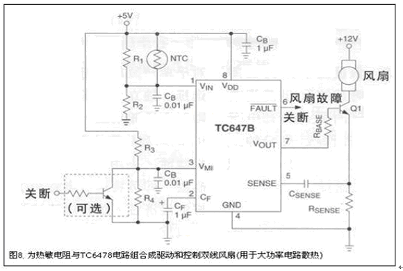 用熱敏電阻與風扇控制器集成電路(ic)組合解決控制大功率電路的散熱方案
