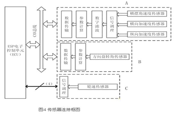 本文所作設(shè)計(jì)的框圖如圖4所示。在圖中,方向盤轉(zhuǎn)角傳感器信號(hào)經(jīng)微控制器處理后,通過CAN總線發(fā)送給ECU(圖4中B);橫擺角速度傳感器、縱向/橫向傳感器由于信號(hào)特點(diǎn)和安裝位置類似,故設(shè)計(jì)在同一個(gè)模塊內(nèi)(圖4中A);由于ESP對(duì)輪速傳感器信號(hào)的實(shí)時(shí)性要求較高,故經(jīng)過信號(hào)調(diào)理后,直接送入ECU(圖4中C)。在圖4的A和B中,需要微處理器對(duì)信