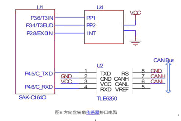 C164CI與方向盤轉(zhuǎn)角傳感器的接口電路如圖6所示。片內(nèi)內(nèi)置增量編碼的正交解碼器,該解碼器使用定時(shí)器3的兩個(gè)引腳(T3IN、T3EUD)作為正交脈沖的輸入,在正確設(shè)置相關(guān)寄存器后,定時(shí)器3的數(shù)據(jù)寄存器的值與方向盤轉(zhuǎn)角成正比,故可方便的計(jì)算轉(zhuǎn)角,本文所使用的方向盤轉(zhuǎn)角傳感器每一圈對(duì)應(yīng)44個(gè)脈沖,設(shè)定時(shí)器3的數(shù)據(jù)寄存器為T3,則絕對(duì)轉(zhuǎn)角為。