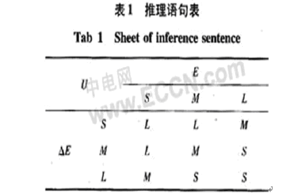 基于神經(jīng)網(wǎng)絡(luò)在推理方面不足,故借助于模糊控制強(qiáng)大的推理功能,提取有效的條件語(yǔ)句,進(jìn)而加快網(wǎng)絡(luò)的訓(xùn)練速度。選取偏差E和偏差變化率△E作為輸入和控制量U作為輸出。偏差E和偏差變化率△E的模糊量分別為大(L),中(M),小(S),創(chuàng)立描述條件推理表格如表1。