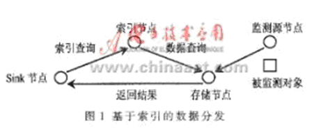 (4)基于索引的數(shù)據(jù)分發(fā)方案(index-based data dissemination scheme)[3],這種方案克服了以上幾種方案存在的問題。在這種方案中,負(fù)責(zé)監(jiān)測(cè)某對(duì)象的源節(jié)點(diǎn)定期產(chǎn)生該監(jiān)測(cè)對(duì)象的感知數(shù)據(jù),并存儲(chǔ)到存儲(chǔ)節(jié)點(diǎn)上,存儲(chǔ)節(jié)點(diǎn)可能是該源節(jié)點(diǎn),也可能是鄰近的某個(gè)節(jié)點(diǎn)。同時(shí),存儲(chǔ)節(jié)點(diǎn)的位置信息(稱為索引),要增加到索引節(jié)點(diǎn)上。當(dāng)sink節(jié)點(diǎn)想查詢某個(gè)被監(jiān)測(cè)對(duì)象產(chǎn)生的感知數(shù)據(jù)時(shí),就發(fā)送一條查詢消息給有關(guān)的索引節(jié)點(diǎn),索引節(jié)點(diǎn)收到該消息后轉(zhuǎn)發(fā)查詢請(qǐng)求給相應(yīng)的存儲(chǔ)節(jié)點(diǎn),由存儲(chǔ)節(jié)點(diǎn)直接發(fā)送查詢結(jié)果給sink節(jié)點(diǎn)。其基本思想如圖1所示。這種數(shù)據(jù)分發(fā)方案避免了發(fā)送不需要的感知數(shù)據(jù),也不需要把控制信息泛洪到整個(gè)網(wǎng)絡(luò),改善了整個(gè)系統(tǒng)的性能,但是增加了維護(hù)索引節(jié)點(diǎn)的額外費(fèi)用。