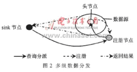 (5)多級(jí)數(shù)據(jù)分發(fā)方案(multi-resolution data dissemination scheme)[4],綜合了LS和DCS數(shù)據(jù)分發(fā)方案的技術(shù)。其基本思想是在數(shù)據(jù)源中選擇一個(gè)頭節(jié)點(diǎn),代表源節(jié)點(diǎn)在最近的注冊(cè)節(jié)點(diǎn)上進(jìn)行注冊(cè)。sink節(jié)點(diǎn)把查詢發(fā)送到所有注冊(cè)節(jié)點(diǎn)上,從注冊(cè)節(jié)點(diǎn)再把查詢發(fā)送到所有匹配的頭節(jié)點(diǎn),當(dāng)頭節(jié)點(diǎn)收到查詢后,在數(shù)據(jù)源內(nèi)選擇一組節(jié)點(diǎn)進(jìn)行查詢。由于sink節(jié)點(diǎn)的位置包含在它分派的查詢中,查詢節(jié)點(diǎn)可以直接把感知數(shù)據(jù)發(fā)送給sink節(jié)點(diǎn),其基本思想如圖2所示。這種數(shù)據(jù)分發(fā)方案避免了查詢泛洪,能有效減少能量消耗。但是在數(shù)據(jù)源中只是基于感知范圍參數(shù)來選擇查詢節(jié)點(diǎn),沒有考慮數(shù)據(jù)的分布情況。