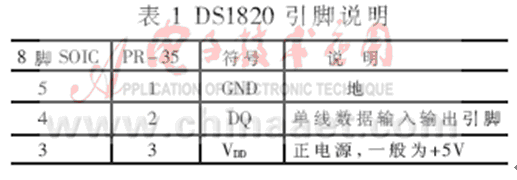 DS1820的PR-35封裝形式見圖1,其外表看起來(lái)像三極管。另外還有8腳SOIC封裝形式,只用3、4和5腳,其余為空腳或不需連接引腳。不過最常見的形式是PR-35封裝,其引腳說(shuō)明如表1所示。