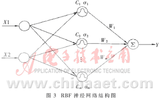 RBF神經(jīng)網(wǎng)絡(luò)即徑向基函數(shù)(Radial Basis Function)神經(jīng)網(wǎng)絡(luò)[3~4],其結(jié)構(gòu)如圖3所示。它很容易擴(kuò)展到多輸出節(jié)點(diǎn)的情形,在此只考慮一個(gè)輸出變量Y的情況。RBFNN包括一個(gè)輸入層、一個(gè)隱含層和一個(gè)輸出層的最簡(jiǎn)模式。隱含層由一組徑向基函數(shù)構(gòu)成,與每個(gè)隱含層節(jié)點(diǎn)相關(guān)的參數(shù)向量為Ci(即中心)和σi(即寬度)。徑向基函數(shù)有多種形式,一般取高斯函數(shù)[5]。具體如下: