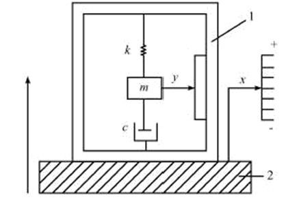 電容式加速度傳感器的等效原理圖如圖2所示。圖2中,右側標尺表示與大地保持相對靜止的運動參考點,稱為靜基準,x表示被測振動體2及傳感器底座1相對于該參考點的位移,稱為絕對位移,y 表示質量塊m 相對于傳感器底座1的位移,稱為相對位移。x和y 之間關系可用典型二階比常系數(shù)微分方程描述: