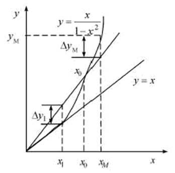 這是電容相對增量與極距相對增量之間的關系方程式。若采用線性特性方程y =x,如圖4所示,顯然其線性誤差較大。為此可采用線性特性方程y=(1+ε)x,并使其在最大量程xM 處產(chǎn)生的正誤差ΔyM 及其x1在處產(chǎn)生的負誤差Δy1在數(shù)值上相等,即: