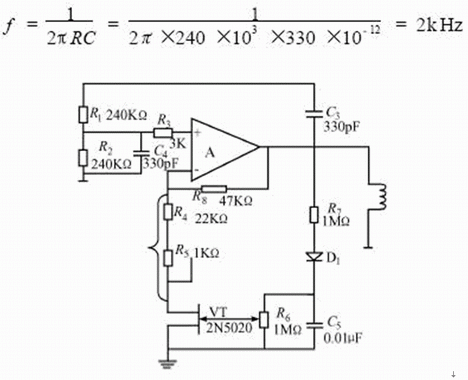 由于放大器的輸出電阻很低,反饋信號加入運算放大的同相輸入端,所以輸入電阻很高,這樣同相放大器的增益KF=1+ R8/Rf,僅與外部電阻R8和Rf有關,而與放大器本身參數(shù)無關,因此增益的精度和穩(wěn)定性都很高。在實際應用中,常選RC串-并聯(lián)電路的R1=R2=R,C1=C2=C,所以在f=1/2πRC這個頻率上, RC移相網(wǎng)絡相位移為零,而R8≈2Rf,滿足振蕩條件。選R=240kΩ, C=330pF,則得到振蕩頻率為:
