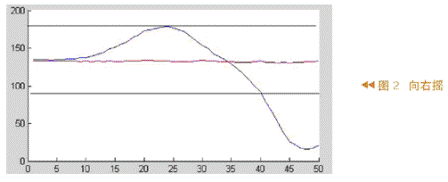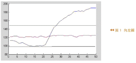 從圖1和圖2中可以看出,兩條黑線之間的數(shù)據(jù)很難斷定是哪個動作產(chǎn)生的,因為兩個動作都可能產(chǎn)生這樣的值。所以,利用黑線之外的數(shù)據(jù)來判定是向右還是向左搖。因為對于這兩個動作,黑線之外的數(shù)據(jù)有明顯的差異,數(shù)據(jù)相差很多。對于圖1這些數(shù)據(jù)大于150,圖2中這些數(shù)據(jù)小于90。因此這些數(shù)據(jù)至少相差60,可以很容易地將向左、向右的兩個動作區(qū)分開。