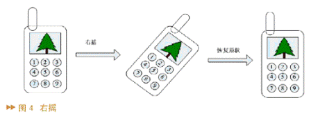 系統(tǒng)設計了六種動作,他們分別是左搖、右搖、下?lián)u、上搖、圖片左轉(zhuǎn)、圖片右轉(zhuǎn)。圖4中的圖形象地說明了其中的兩個動作,其它的動作與此類似。