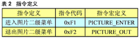 系統(tǒng)還定義了單片機與演示終端交互的指令,用于系統(tǒng)在主菜單和二級菜單之間的界面切換,指令從演示系統(tǒng)通過SCI傳給單片機,單片機接收到之后進入或退出二級菜單,見表2。