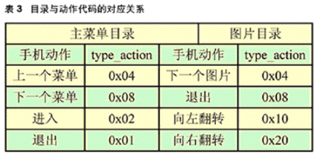 仿真器的外觀和操作類似一部移動電話,但是并不代表某個特定的設備,而是提供對其所支持的API 的正確實現(xiàn),每個命令按鈕對應著相應的API函數(shù)。從圖6中可以看到手機的導航鍵,我們更改了導航鍵的API函數(shù),使其從鼠標單擊觸發(fā)的方式轉(zhuǎn)換為串口動作代碼控制。首先,我們編寫了J2ME的串口接收程序,用于接收從單片機傳來的單字節(jié)的type_action值;然后將type_action以參數(shù)的形式傳給API,手機根據(jù)不同的type_action值執(zhí)行不同的動作,包括菜單上下翻、進出二級子菜單、圖片翻轉(zhuǎn)等。手機動作與type_action的對應關系如表3。