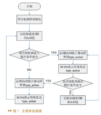 系統(tǒng)上電后,首先要對單片機的硬件系統(tǒng)進行初始化、配置寄存器等操作,之后才可以進行數(shù)據(jù)采集,將加速度的值進行A/D轉(zhuǎn)換,得到量化的值。圖片菜單是二級菜單,如果沒有接到演示系統(tǒng)傳給單片機進入二級菜單的指令,則單片機一直在主程序運行,不斷地采集A/D值、進行動作判定,并向演示系統(tǒng)發(fā)送type_action的指令。演示系統(tǒng)可根據(jù)接收到的type_action的類型采取相應的動作。如果單片機接收到進入二級菜單的命令,則進入圖片菜單,同時也執(zhí)行類似于主程序的動作判定程序,并不斷更新A/D采樣值,發(fā)送type_action,直到接收到退出二級菜單指令才退出。下面詳細介紹一下各個功能模塊的具體設置。