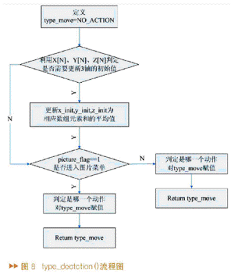 動作檢測主要是用獲得的三組數(shù)據(jù)值x_data[N]、y_data[N]、z_data[N]來判定當前動作是系統(tǒng)設定動作中的哪一個,如果符合,則發(fā)送這個動作對應的預定義值給演示終端,否則發(fā)送NO_ACTION。type_dectction()用來實現(xiàn)動作檢測,其中type_move為函數(shù)內(nèi)部變量,用于記錄動作代碼。type_dectction()進行動作檢測的流程如圖8所示。