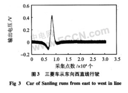圖3、圖4比較可以看出:橫軸顯示圖3有效信號(hào)的跨度比圖4的小,圖3中輸出磁信號(hào)的幅值大于0.4V,而圖4中小于0.3 V,即圖3中的輸出信號(hào)幅值比圖4中的大。這是因?yàn)閳D3中的目標(biāo)移動(dòng)速度較大,另外,由于2個(gè)目標(biāo)不同,即對(duì)傳感器周圍的磁場(chǎng)影響程度不一樣,故測(cè)得的輸出信號(hào)幅值也不同。