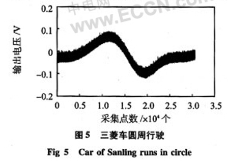 直線法和圓周法比較可以看出:圖5、圖3、圖4中的曲線變化規(guī)律明顯不同,曲線形狀變化較大是因?yàn)槟繕?biāo)運(yùn)動(dòng)方式不同,即影響磁場(chǎng)的方式不同,從而測(cè)得曲線有差別,圖5曲線中有個(gè)較大的峰值,是因?yàn)檐囋趫A周行駛時(shí),在采集信號(hào)期間車有一次通過傳感器敏感軸的正方向。另外,由于采集時(shí)間有限,所以,曲線沒有反映信號(hào)周期性變化,若采集時(shí)間達(dá)到2個(gè)周期,則會(huì)出現(xiàn)2個(gè)主峰。