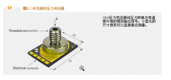 創(chuàng)新的傳感器包裝由多層陶瓷(LTCC或HTCC)制成。這樣,整個信號處理電路的電氣互連都可以合并在陶瓷層中。測量信號由信號傳感器放大,該傳感器通過單獨編程補償靜態(tài)傳感器故障。壓力變送器的輸出信號與標準化的界面一致,變化范圍介于0.5 V至4.5 V。這樣可以保證向信號處理單元的傳送具有足夠的抗干擾性。無需使用其它信號處理電路板。圖2顯示的是具有所有壓力測量和信號處理所需元件的OEM傳感元件。