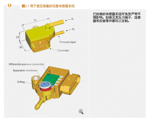 如果將壓力變送器用作獨立測量系統(tǒng),必須保護其免受外部環(huán)境影響,如在其結合處附件的灰塵和水霧。這一點是通過使用在大多數應用中都具有良好的媒介抵抗性和充分的溫度穩(wěn)定性的塑料封裝實現的。該封裝及其壓力端子、連接器和安裝零件都適合客戶定制(圖3)。對于要求極高的應用,還可以提供不銹鋼封裝版本。應用包括測量差壓、監(jiān)測腐蝕性氣體濾波器和測量冷卻劑壓力。
