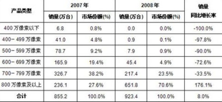 表2 2008年中國數(shù)碼相機(jī)市場不同產(chǎn)品像素類型銷量及增長情況